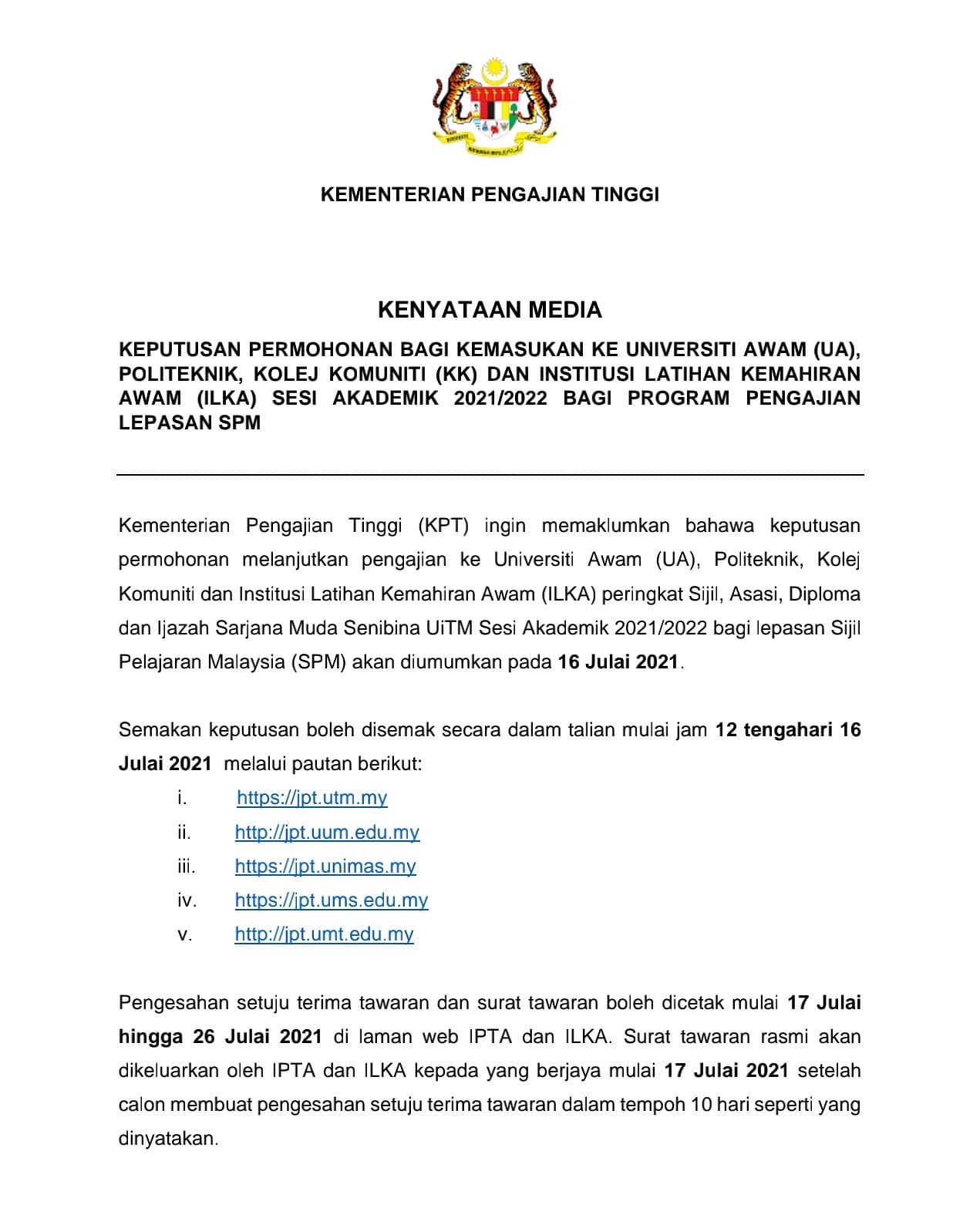 Kementerian Pengajian Tinggi On Twitter Kenyataan Media Keputusan Permohonan Bagi Kemasukan Ke Universiti Awam Ua Politeknik Kolej Komuniti Kk Dan Institusi Latihan Kemahiran Awam Ilka Sesi Akademik 2021 2022 Bagi Program Pengajian Lepasan